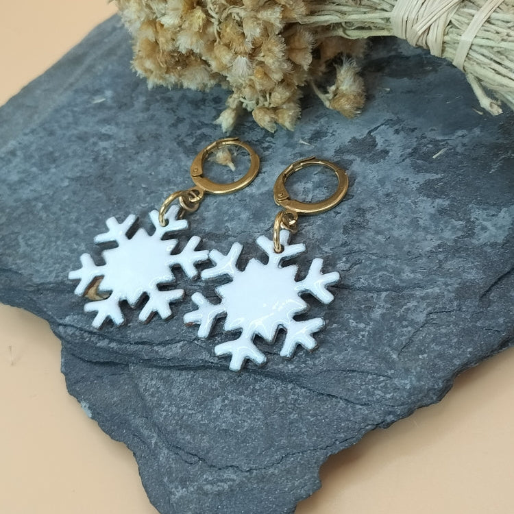 Petit clin d' oeil à notre "or blanc"! Avec ces jolis flocons blancs et brillants , vous vous démarquerez avec originalité et douceur. Ces boucles, très légères , ont été montées avec des dormeuses en acier inoxydable doré. Diamètre du flocon: 25 mm.