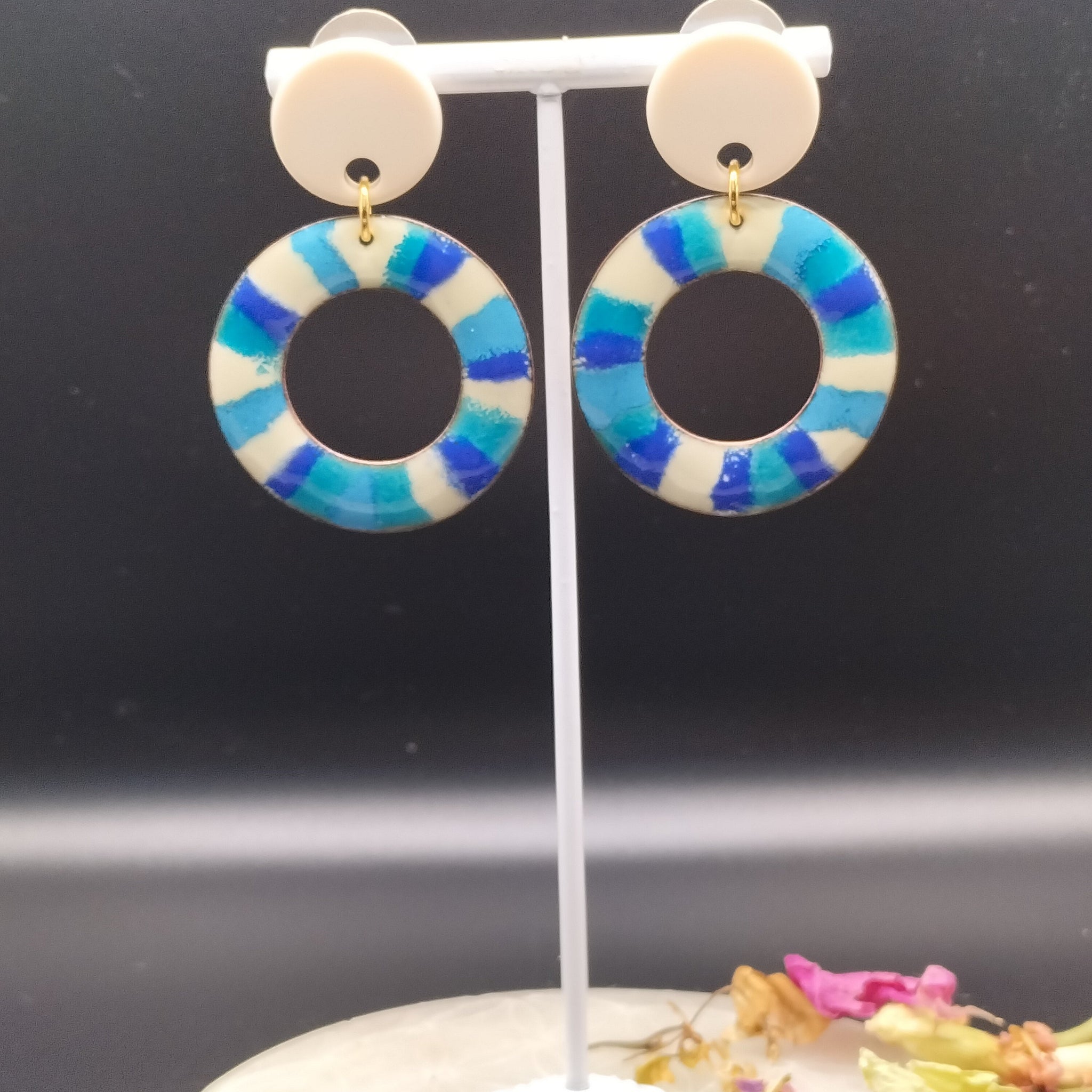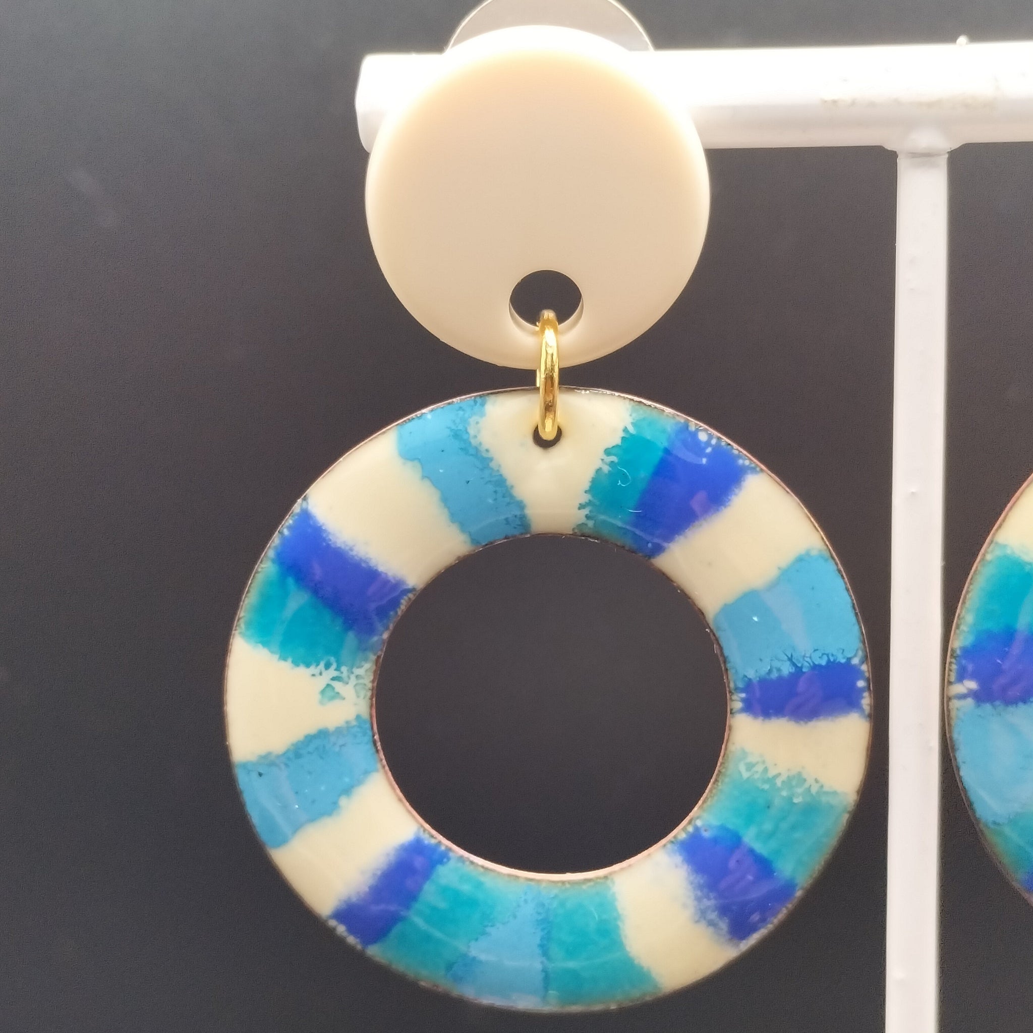 Crochets d’oreilles avec rond en acrylique ivoire et clou en acier inoxydable . Le cercle du bas (35 mm de diamètre ) est découpé dans une plaque de cuivre et émaillée à 800°. Toutes les médailles émaillées sont réalisées à la main . Plusieurs couches d'émail sont nécessaires pour obtenir ce bel aspect moucheté. Hauteur totale des boucles : 55 mm. Bijoux uniques . Colorez votre vie !