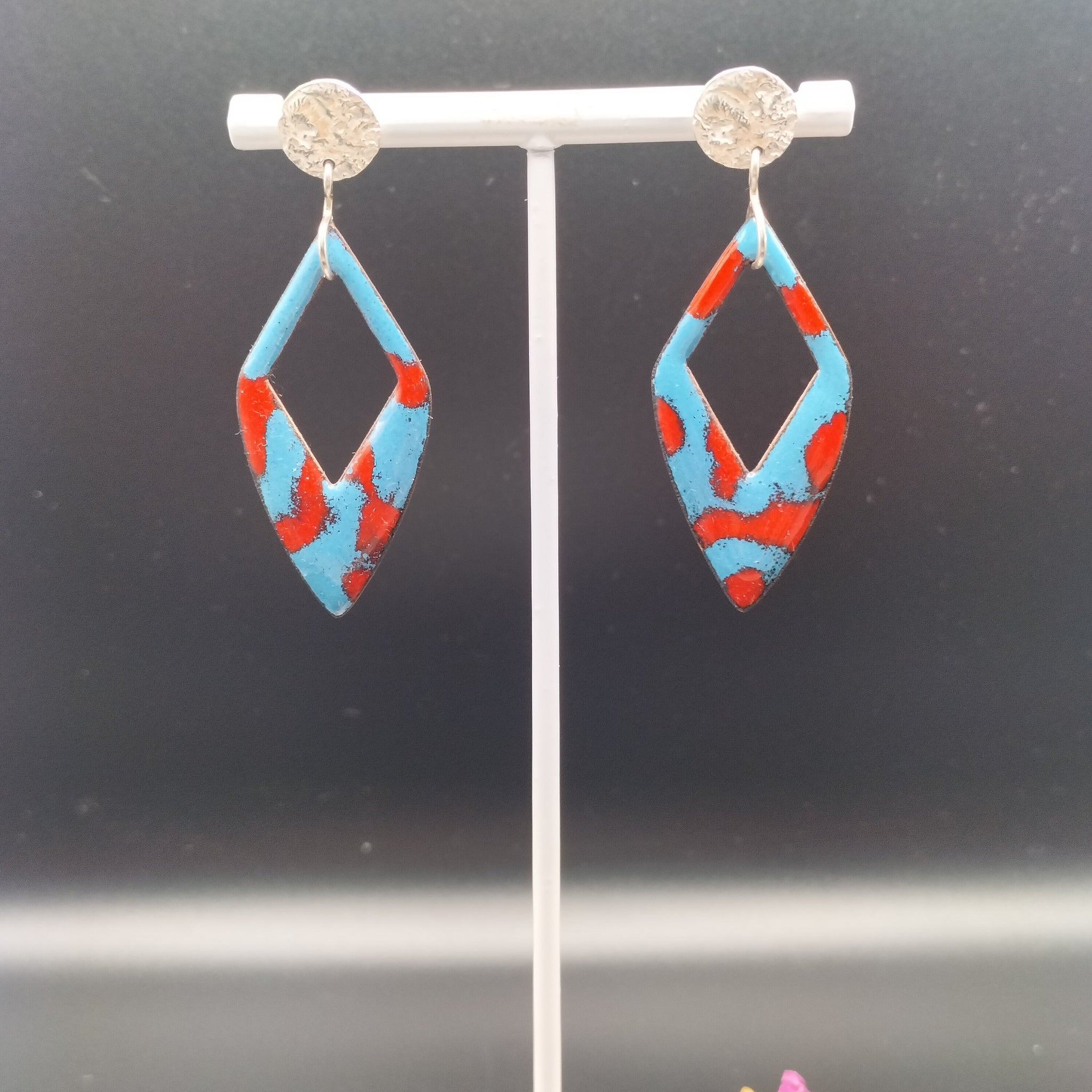 Ces boucles sont originales grâce à leur forme géométrique et leurs crochets en argent 925 martelé . Les dessins crées par les émaux rouge et bleu peuvent présenter des différences par rapport à la photo car chaque pièce est réalisée à la main et l'émail réagit différemment à chaque cuisson. Hauteur totale : 55mm.