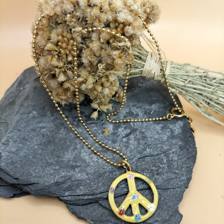 Ce collier , orné d'un pendentif Peace and love , est émaillé avec des couleurs douces et lumineuses comme le bleu céruléum et le jaune . Un côté floral est apporté par de petites fleurs colorées fusionnées à l'émail bleu ou jaune du dessous. Une touche de fantaisie, toute en douceur, grâce à cette jolie forme emblématique . Chaîne boule en acier inoxydable doré ou chaine émaillée multicolore en plaqué-or .Longueur totale : 40 et 43 mm.