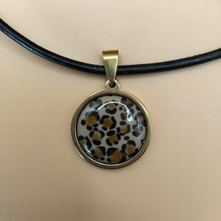 Collier ras de cou , en cuir noir et pendentif motif léopard . Support en acier inox doré. Les motifs sont dessinés à l'aide d'une plume car l' émail utilisé est un émail liquide. Le fond est réalisé en émail de couleur beige. Longueur du collier: 43.5 mm.