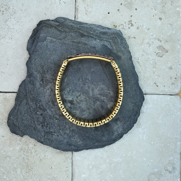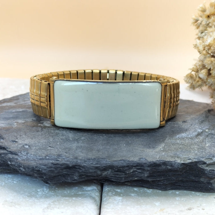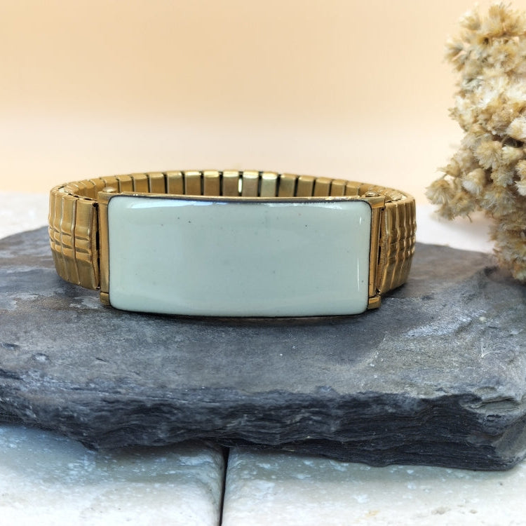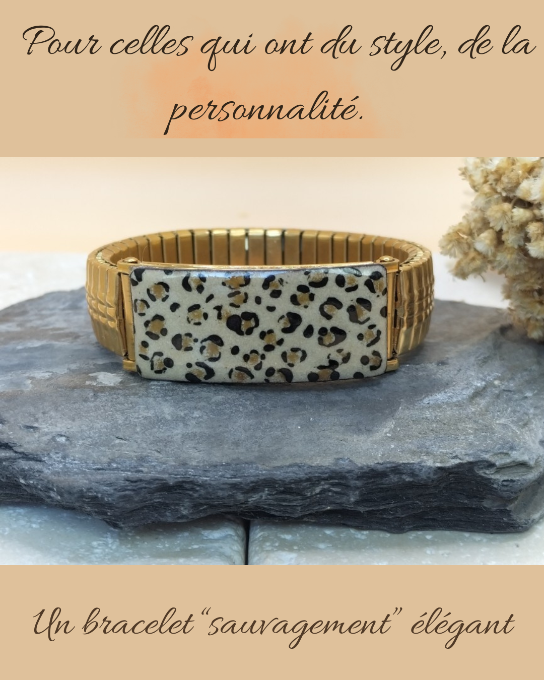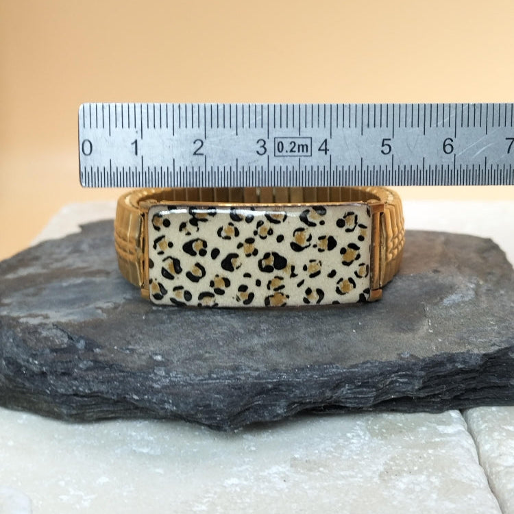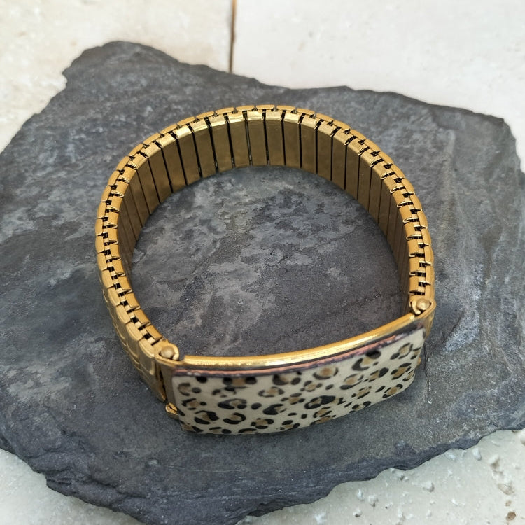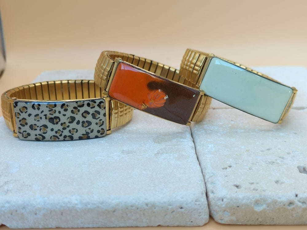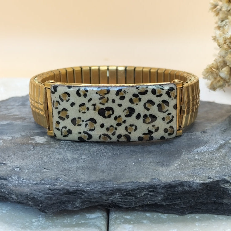 Nouveauté ! Création originale et unique, ce bracelet élastique, en acier inoxydable doré, sera facile à porter en toutes circonstances. Il est très simple à mettre et est orné d'une partie émaillée . Chaque pièce est unique et réalisée artisanalement. Le dessin "léopard" est réalisé sur une base d'émail en poudre beige puis décoré, à la plume , avec de l'émail liquide noir. Dimensions : largeur :14 mm, plaque émaillée : 40 x 14 mm. Il s'adaptera à votre poignet, toutefois une taille de poignet minimale est requise ,pour un rendu impeccable: soit 16.5 cm.